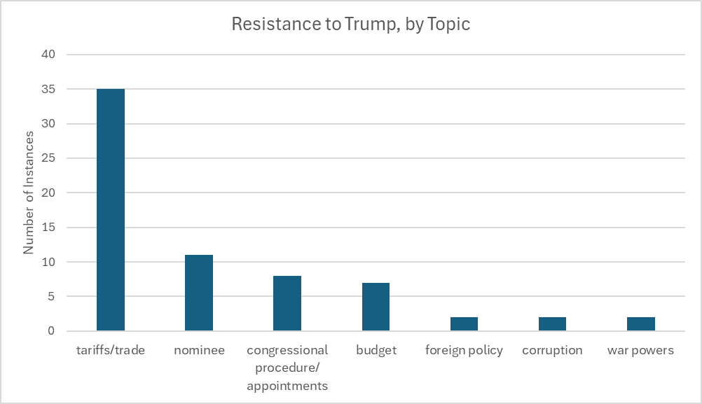 There are probably many reasons for this. Opportunity is an important one. As shown in the chart, the two most common issues on which lawmakers have disagreed with Trump are trade policy (usually tariffs) and presidential nominees.3 Nominees are confirmed by the Senate, not the House, and House members are unable to force roll calls on measures that would repeal Trump’s tariffs because the chamber has voted to block individual lawmakers from doing so.