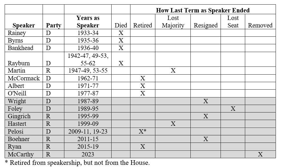 Until the mid-1980s (the non-shaded portion of the table), almost all speakers stayed in office until they died or retired. That is no longer the case. While Pelosi and Ryan ended their careers by retiring from the post (and, in Ryan’s case, also retiring from Congress), the most common means of ending one’s term since 1987 has been to resign in the middle of one’s term (Wright, Gingrich, and Boehner), something that was once unheard of. Other speakers existed the job by losing reelection (Foley), when their party lost its majority in an election (Hastert), or by being removed by the House (McCarthy).